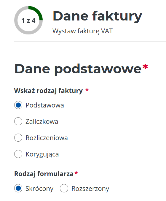 Zawsze w KSeF należy wybrać na samym początku z jaką fakturą mamy do czynienia, standardowa faktura w normalnych okolicznościach będzie oznaczana przez wybranie "Podstawowa" oraz "Skrócona".