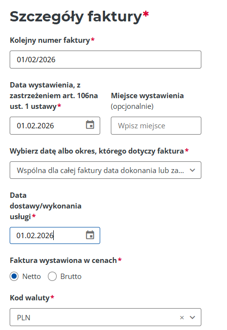 Pan Jan będąc przedsiębiorcą ma obowiązek wystawienia faktury najpóźniej do 15 marca 2026r., datą sprzedaży będzie natomiast 1 luty 2026r. Jeżeli Pan Jan następnego dnia wystawia fakturę, czyli 2 lutego to w KSeF możliwa do wyboru jest wyłącznie data wystawienia 2 lutego.