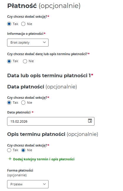 Jeżeli chcemy dodać informację dotyczącą płatności, jej formy lub daty albo terminu, należy wybrać w poszczególnych pozycjach "Tak" albo "Nie" i następnie uzupełnić pola. Dla faktury do zapłaty przelewem z terminem płatności 15 lutego 2026r. należy uzupełnić pozycje w sposób następujący.