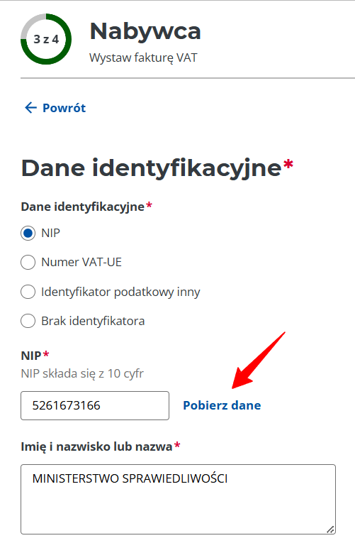 W przypadku JST, niezbędne jest wprowadzenie dodatkowych danych odbiorcy, gdzie najczęściej nabywcą jest JST, a odbiorcą jest jakaś instytucja należąca do JST (często placówki oświaty). W takim wypadku w danych nabywcy czyli w pkt. 1 etapu 3) powinniśmy wprowadzić NIP JST i dane (przykładowo Gminy, Miasta, Powiatu), a następnie w etapie 4) przykładowo Szkoły podlegającej danej JST.