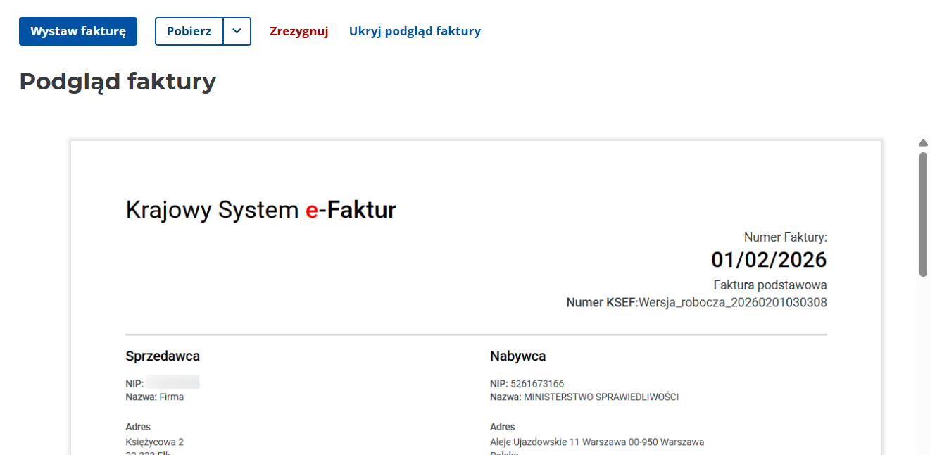 Po uzupełnieniu danych zawsze należy wybrać "Podgląd faktury" i następnie sprawdzić czy wszystkie dane na fakturze są zgodne z zamierzonymi. Jeżeli dane zgadzają się, można fakturę pobrać w XML lub "Oficjalnie" ją wystawić w KSeF przez wybranie "Wystaw fakturę".